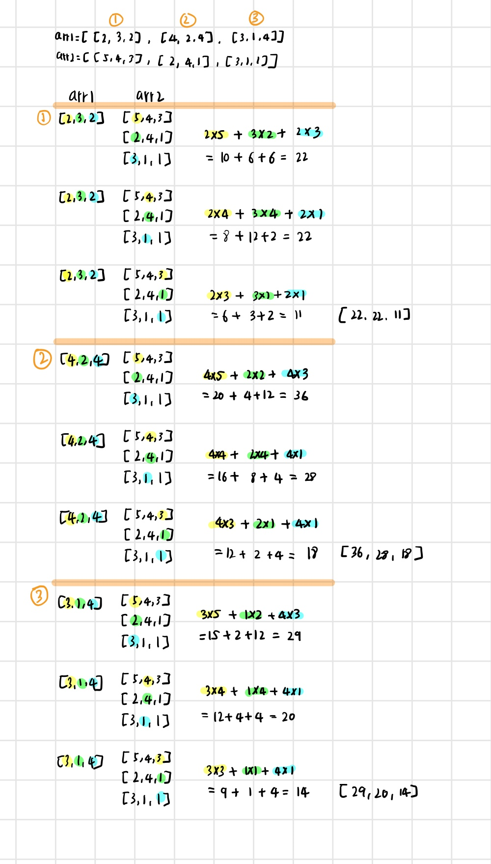 제가 행렬의 곱셉 문제에 나와 있는 테스트로 손으로 써가면서 행렬의 곱셈을 해보았습니다.