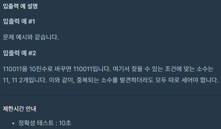 - 211, 2, 11이 10진수 기준으로 소수인 개수를 세면 됩니다.