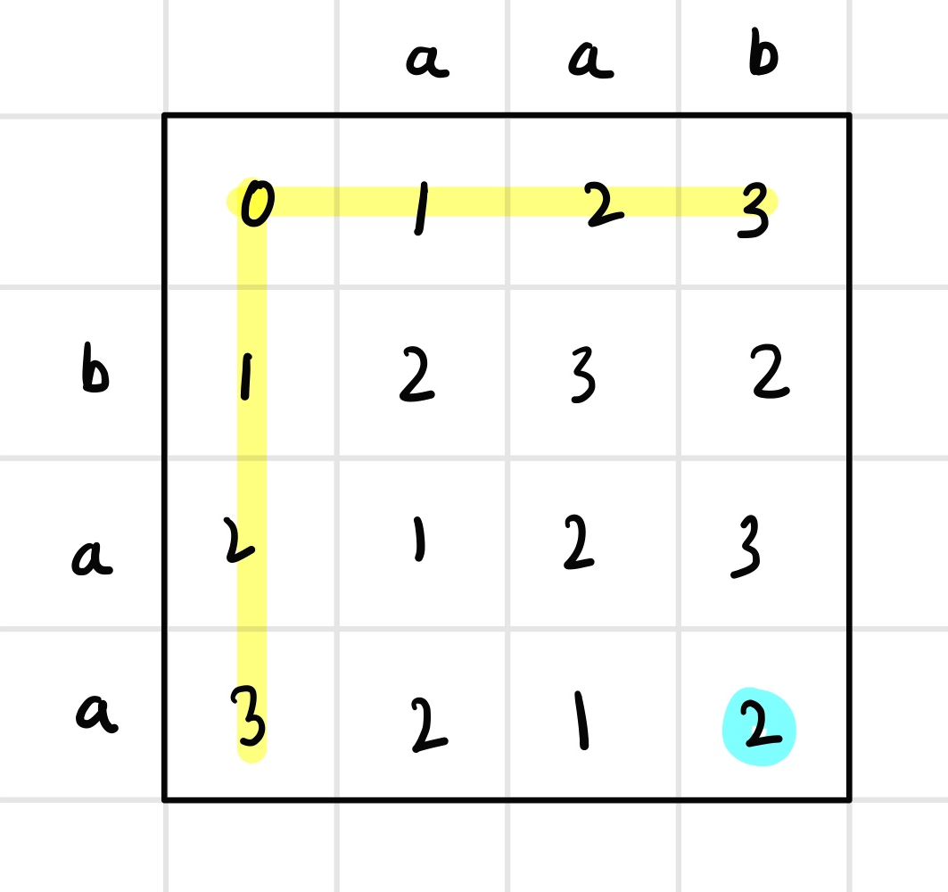 x='baa'와 y='aab'가 주어졌을 때 x와 y의 편집 거리를 구하시오.