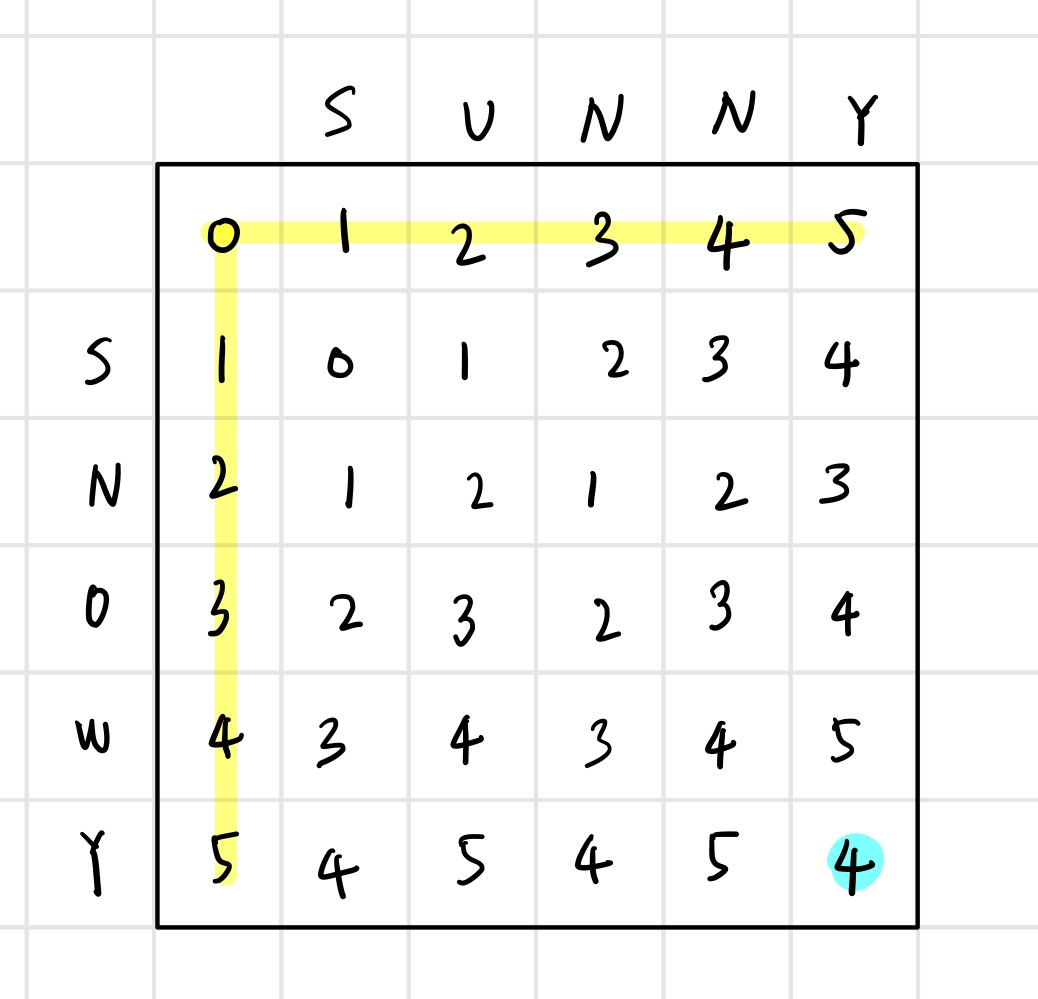 x='SNOWY'와 y='SUNNY'가 주어졌을 때 x와 y의 편집 거리를 구하시오.