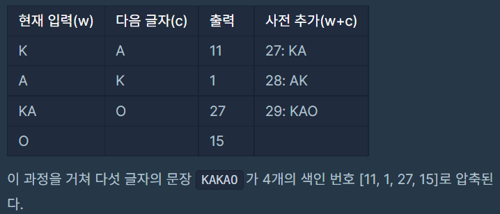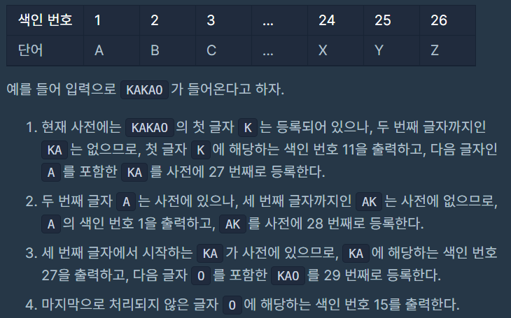 -> 사전에 가장 긴 문자열 길이 : 3 - 현재 입력될 위치부터 사전에 가장 긴 문자열 길이만큼 문자열이 사전에 있는지 확인합니다.