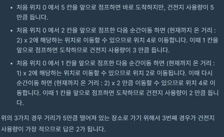 처음 위치 0 에서 1 칸을 앞으로 점프한 다음 순간이동하면 (현재까지 온 거리 : 1) x 2에 해당하는 위치로 이동할 수 있으므로 위치 2로 이동됩니다. 이때 다시 순간이동하면 (현재까지 온 거리 : 2) x 2 만큼 이동할 수 있으므로 위치 4로 이동합니다. 이때 1 칸을 앞으로 점프하면 도착하므로 건전지 사용량이 2 만큼 듭니다.
