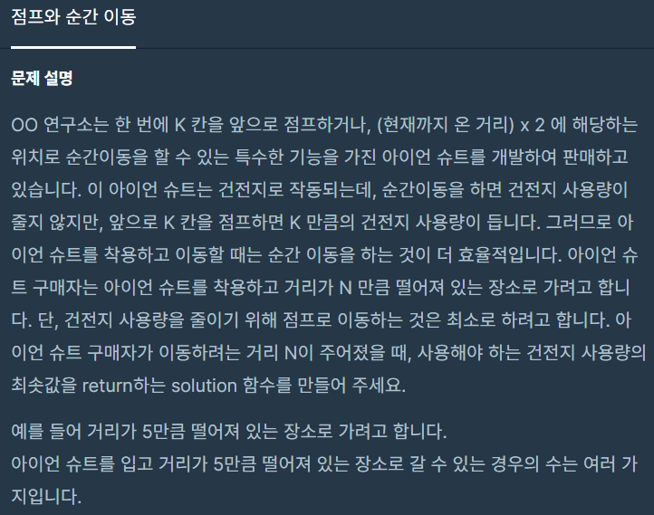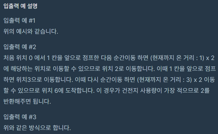 처음 위치 0 에서 1 칸을 앞으로 점프한 다음 순간이동하면 (현재까지 온 거리 : 1) x 2에 해당하는 위치로 이동할 수 있으므로 위치 2로 이동합니다. 이때 1 칸을 앞으로 점프하면 위치 3으로 이동합니다. 이때 다시 순간이동하면 (현재까지 온 거리 : 3) x 2 이동할 수 있으므로 위치 6에 도착합니다. 이 경우가 건전지 사용량이 가장 적으므로 2를 반환해주면 됩니다.