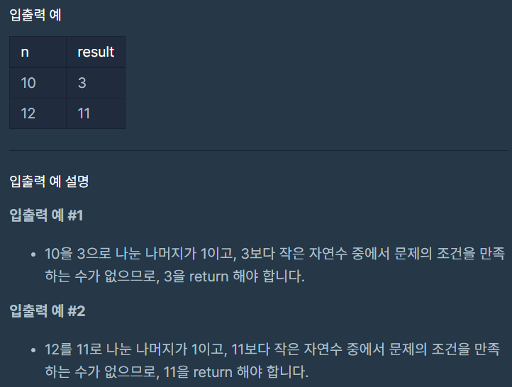 문제 설명에서 "자연수 n이 매개변수로 주어집니다. n을 x로 나눈 나머지가 1이 되도록 하는 가장 작은 자연수 x를 return 하도록 solution 함수를 완성해주세요."문장에서