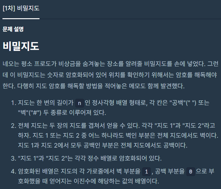 여기까지 프로그래머스 비밀지도 해결방안에 대해 설명해보았습니다.