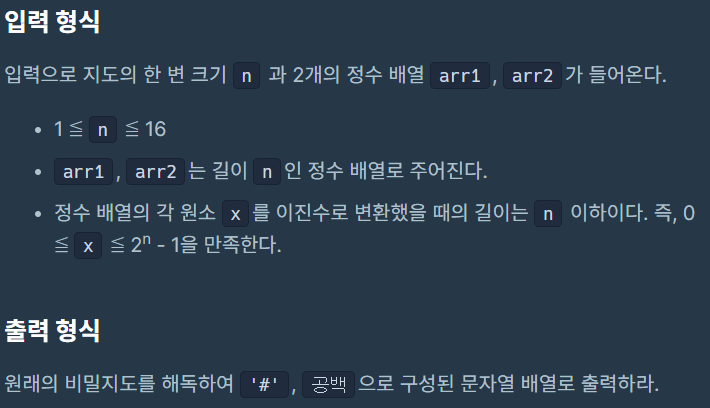 - 1단계에서 만든 2차원 배열 arr1Bs, arr2Bs을 비교하여 둘 중 하나 #이 있으면 #으로 아니면 공백으로 바꾸기