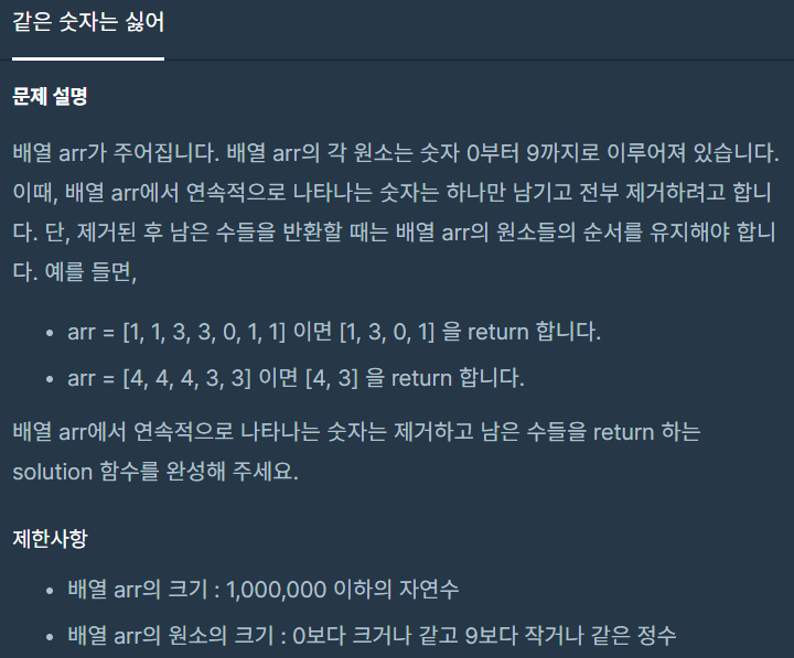 여기까지 프로그래머스 같은 숫자는 싫어 해결방안에 대해 설명해보았습니다.