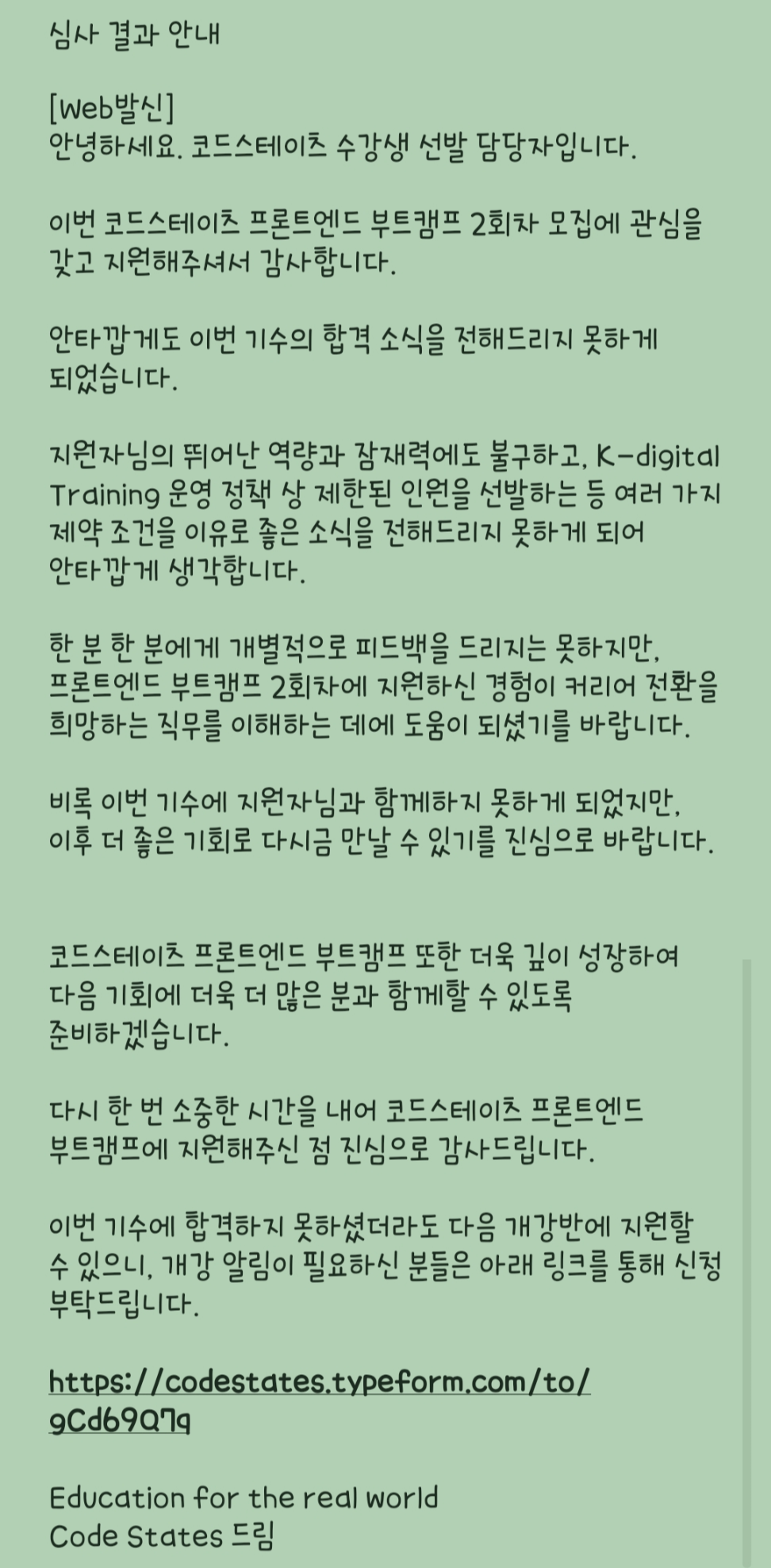 통보받자마자 그동안 제가 노력했던 게(자바스크립트 공부, 리액트 공부, 알고리즘 공부) 떠오르면서 그동안 노력한 게 다 무산이 되는 기분이 들어서 너무 힘들었고, 코드스테이츠를 하고 싶어서 노력을 했는데 그만큼의 결과가 안 나와서 속상하고, 내가 부족한 사람인가 생각이 들면서 항상 내가 제일 바라는 건 안 이루어 질까라는 자책까지 모든 안 좋은 감정을 다 합해져서 엉엉 울었습니다....😭