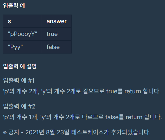 마지막으로 lcs문자열에서 p와 y의 갯수가 같으면 true, 아니면 false 반환해야 되는데
