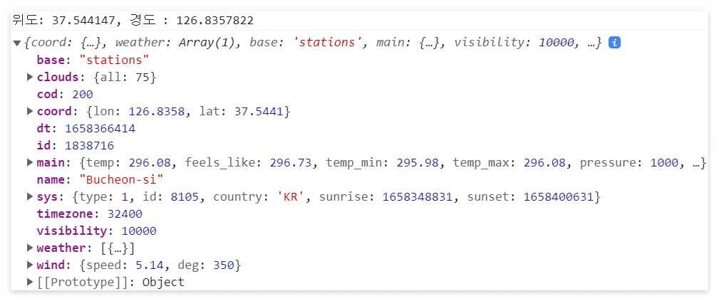 그럼 weatherData(lat, lon)에서 인자 값으로 사용할 수 있습니다.