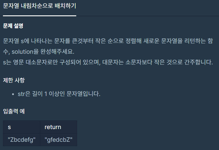 이 문제는 문자열 s에 나타나는 문자를 큰 것부터 작은 순으로 정렬해 새로운 문자열을 리턴하는 문제입니다.
