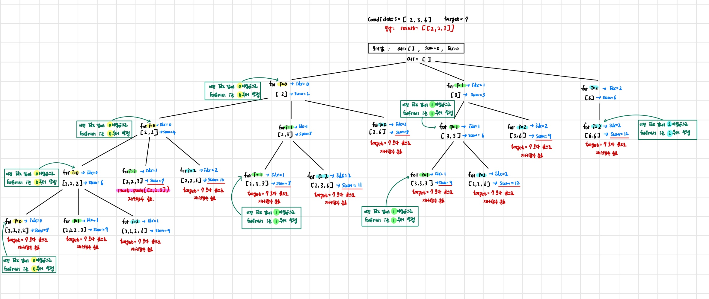 condidates = [2, 3, 6], target=7일 경우에 돌아가는 구조입니다.