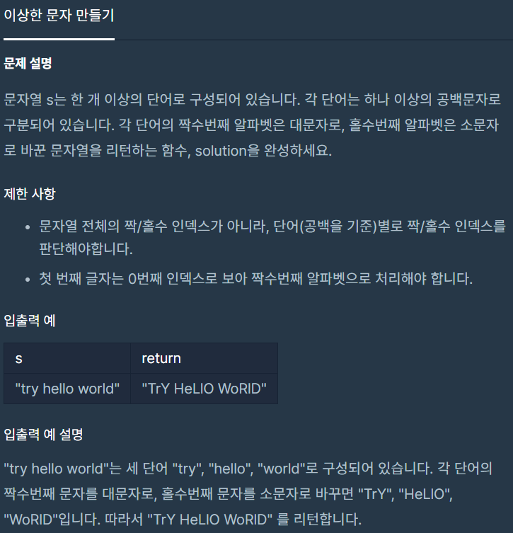 여기서 구해야 되는 게 "각 단어의 짝수번째 알파벳은 대문자로, 홀수번째 알파벳은 소문자로 바꾸기" 뿐만 아니라 "각 단어는 하나 이상의 공백 문자로 구분하기"도 해주어야 됩니다.