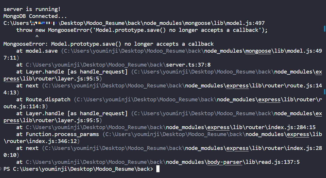MongooseError: Model.prototype.save() no longer accepts a callback이 오류가 떠서 확인해보니 Mongoose6부터 callback 문법이 사용되지 않는다고 합니다버전을 바꾸는 것은 시도 하지 않았고.then .catch ...