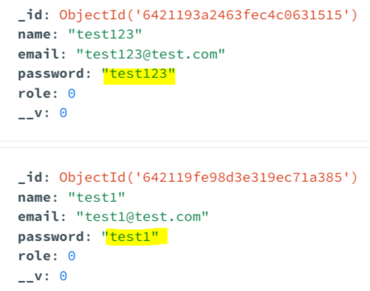 몽고디비 컴패스를 보면 비밀번호가 그대로 나와 있다는 것을 알 수 있습니다.