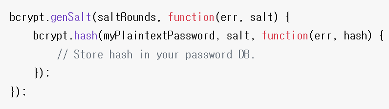 bcrypt.hash(user.password, salt, function (err, hash){ // hash는 암호화된 비밀번호