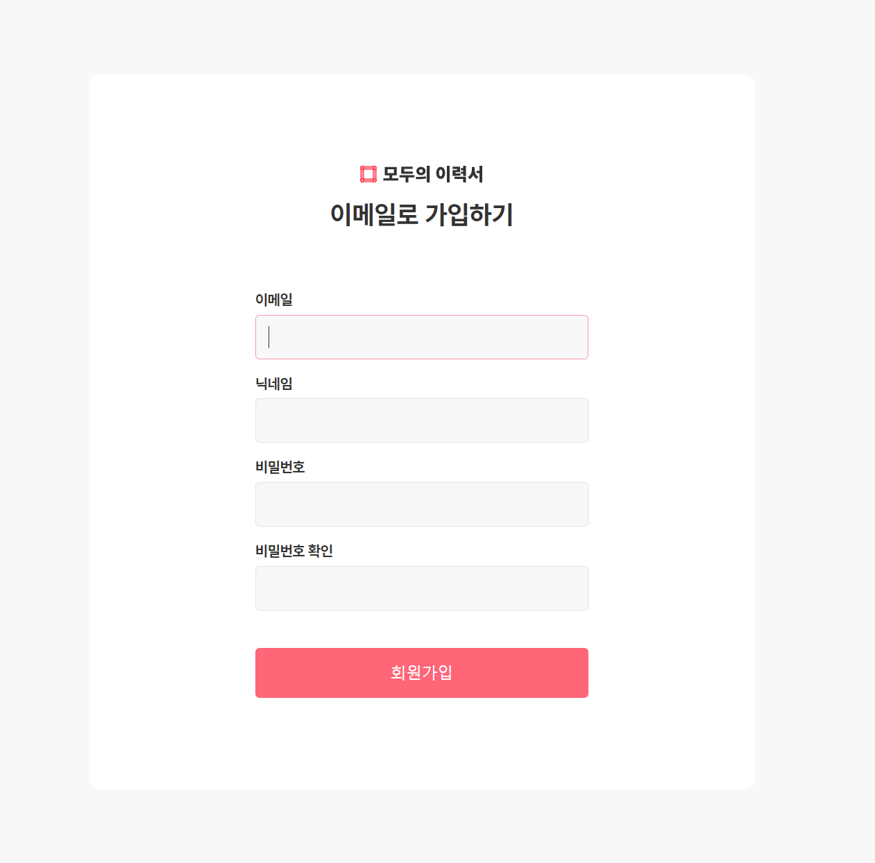 이메일, 닉네임, 비밀번호, 비밀번호 확인 → 회원가입 버튼
