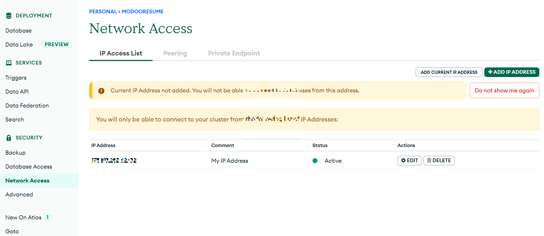 회사에서 작업하다 집에서 작업을 하게 됐는데 MongooseServerSelectionError를 마주했다 mongoDB에 접근 가능한 IP가 아닐 때 발생하는 에러다 mongoDB에 접근 가능하도록 등록을 해주면 해결된다 ① mongoDB