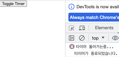 Toggle Timer를 클릭하면 타이머가 실행이 되는데, Toggle Timer를 다시 클릭해도 타이머가 멈추지 않는다.