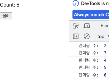 콘솔로그가 계속해서 찍히는 이유는 state가 증가될 때마다 컴포넌트가 다시 렌더링이 되기 때문이다.