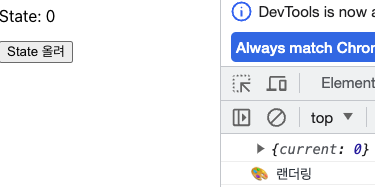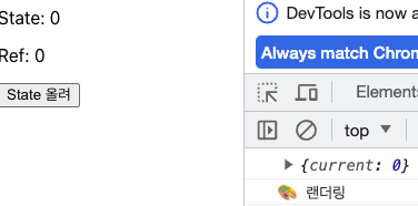 여기서 State 올려를 클릭하면 다시 렌더링이 일어나고 화면이 업데이트가 되기 때문에 Ref값도 업데이트가 된다.