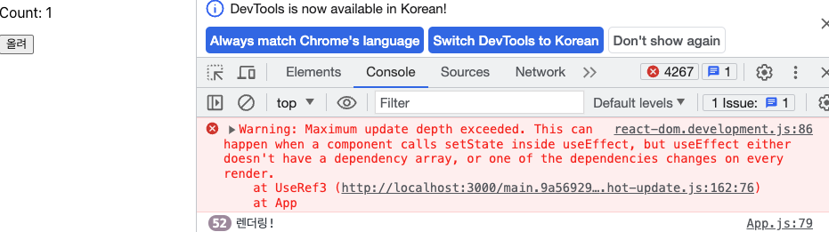 (useEffect의 의존성 배열이 없음 -> 렌더링 될 때마다 useEffect가 호출된다.)