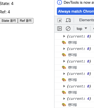 여기서 State 올려를 클릭하면 화면 렌더링이 되기 때문에 state도 증가하고 ref도 한 번에 증가하는 걸 볼 수 있다.