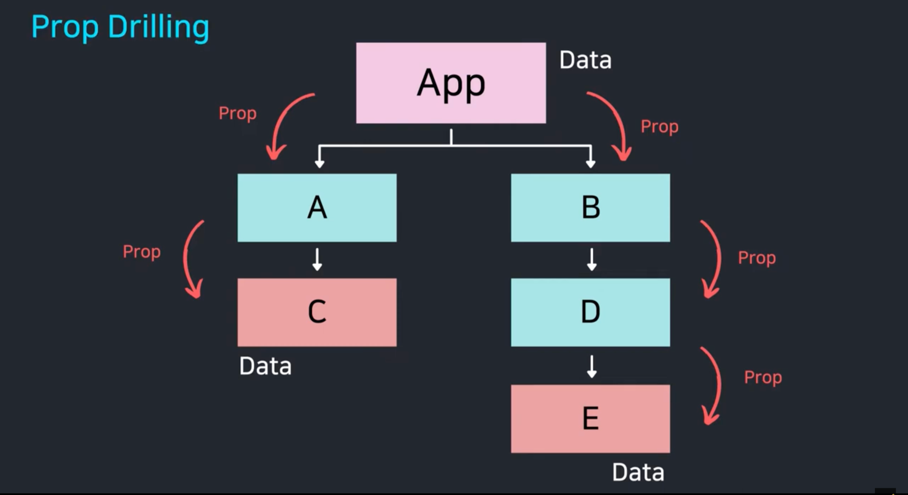 가장 밑에 있는 C, E컴포넌트만 데이터가 필요한데 전달하는 과정에서 데이터는 모든 중간 컴포넌트를 거쳐가야 된다.