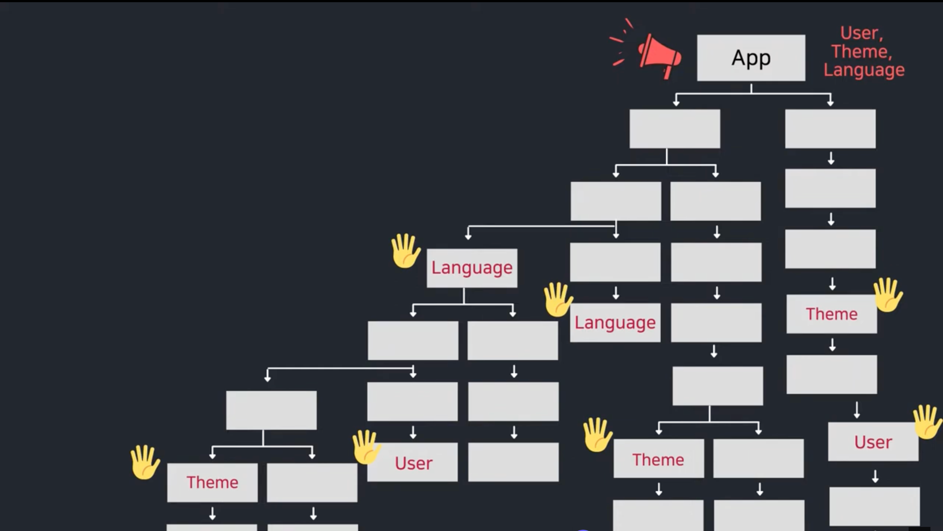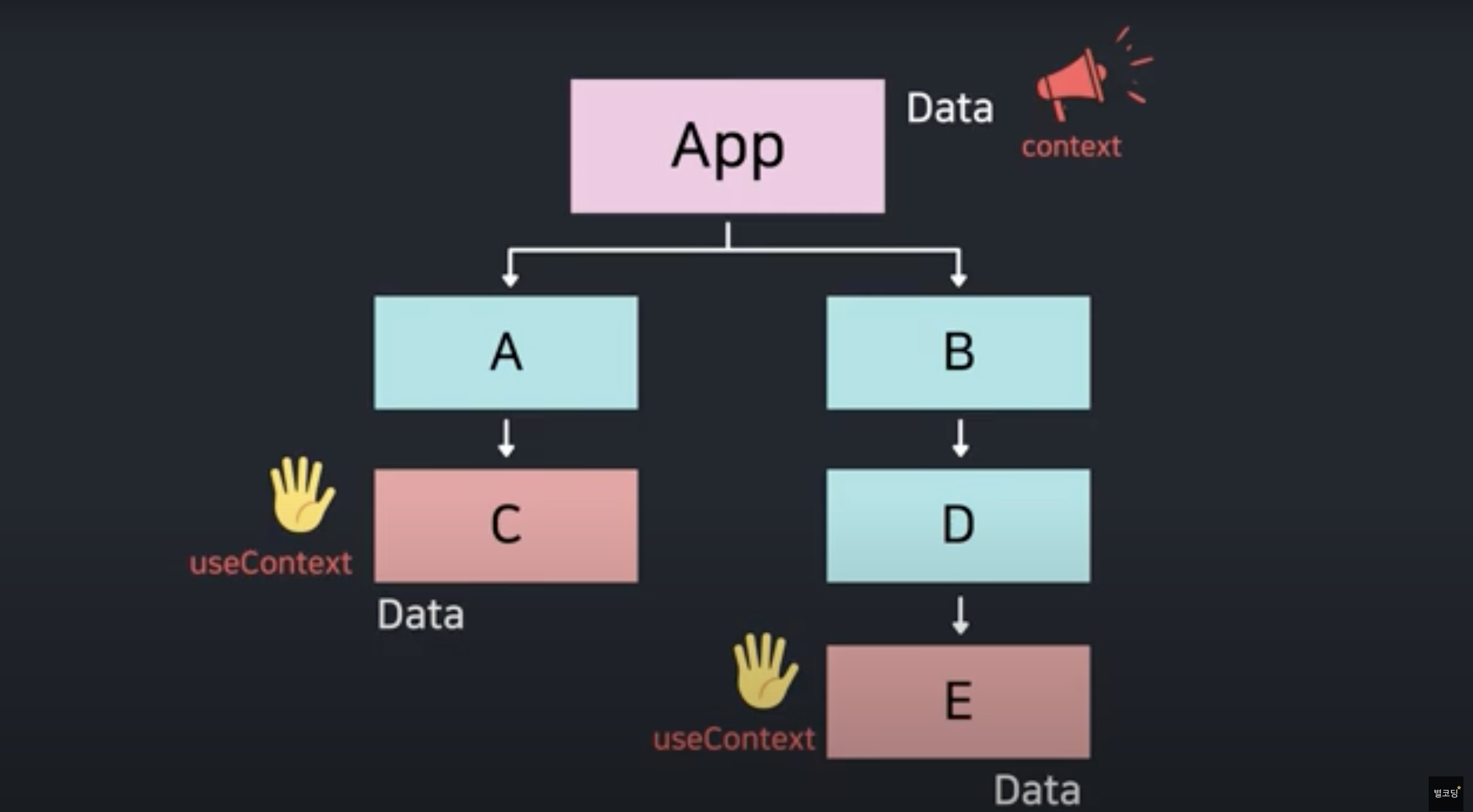해당 데이터를 갖고 있는 상위 컴포넌트가 "이 데이터 필요한 사람"하고 하위 컴포넌트들에게 방송을 해줄 수 있다.