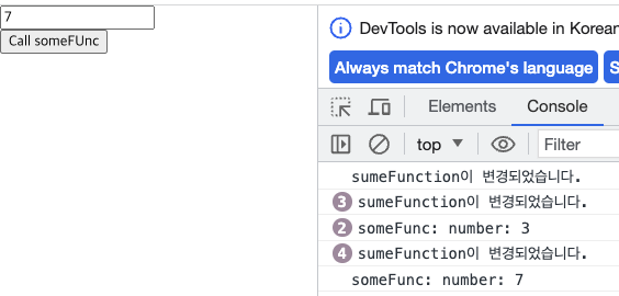숫자를 증가시킨 뒤 Call someFunc를 클릭하면 0이 출력된다.
