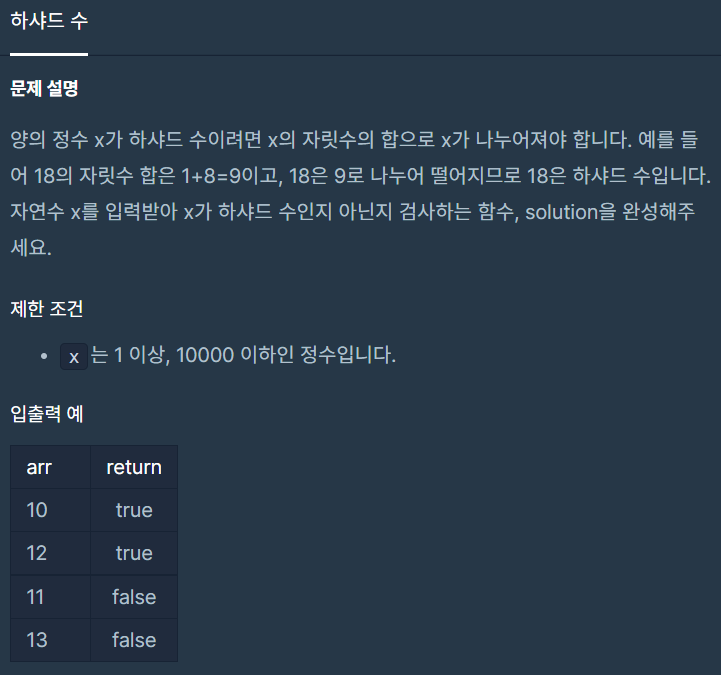 문제 설명에서 "양의 정수 x가 하샤드 수이려면 x의 자릿수의 합으로 x가 나누어져야 합니다."라는 문구가 있습니다.