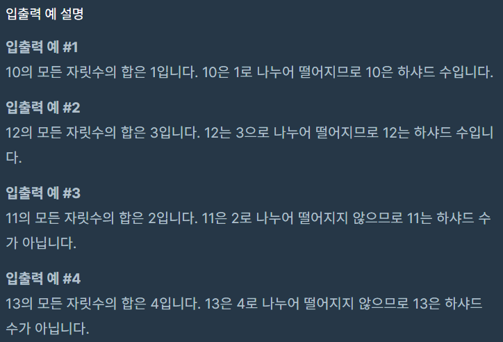 이 말은 하샤드 수이면 x % sum에서 무조건 0이 나오게 됩니다.