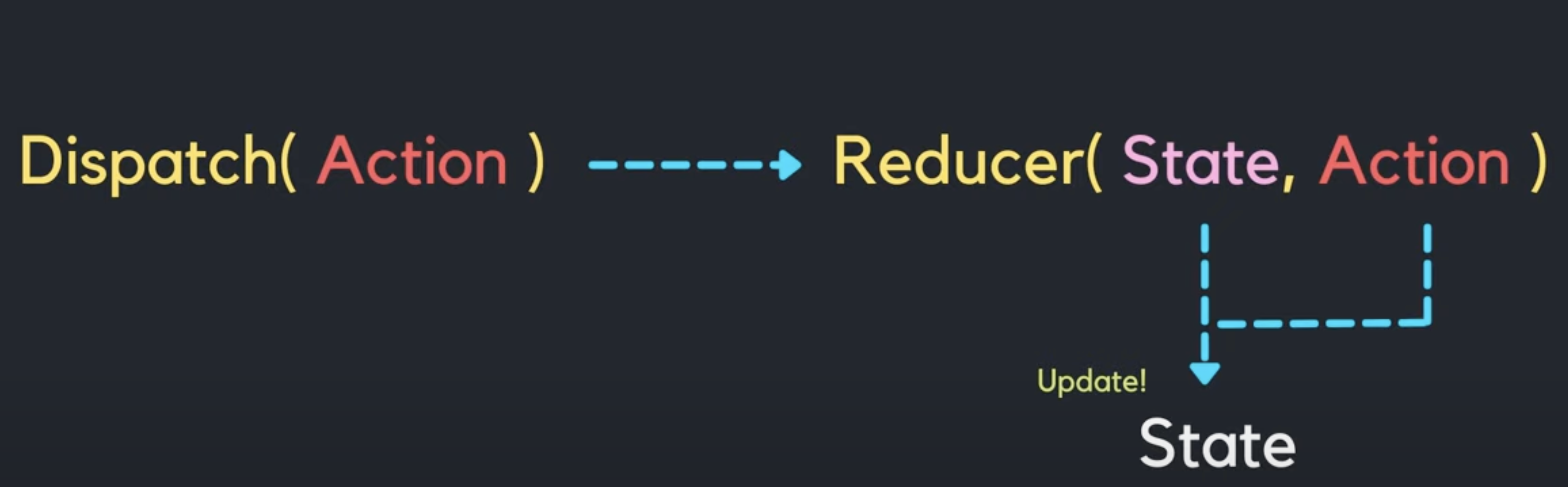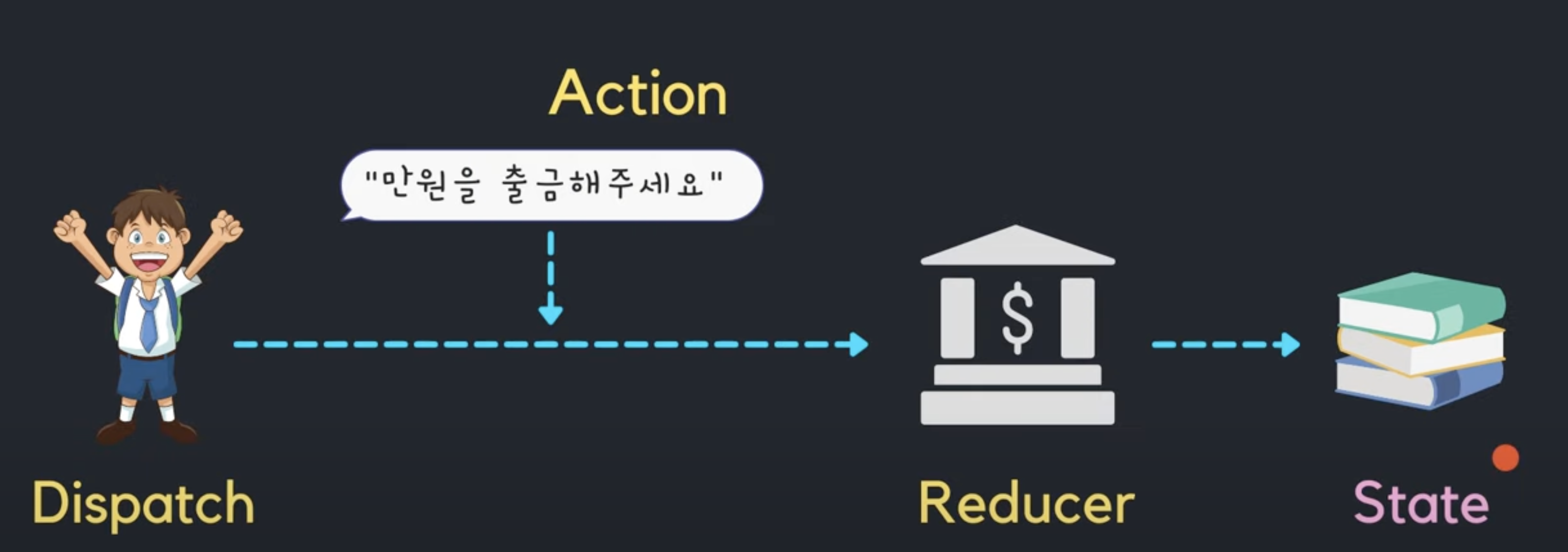 철수가 거래내역(State)을 업데이트하기 위해서는 요구(Dispatch)에 "만원을 출금해 주세요."(Action)라는 내용을 담아 은행(Reducer)에 전달하면 은행(Reducer)은 내용(Action) 내용대로 거래내역(State)을 업데이트 해주는 것이다.
