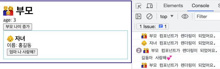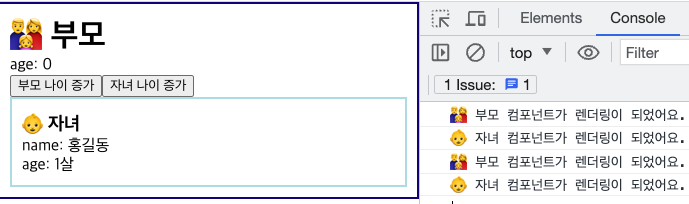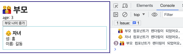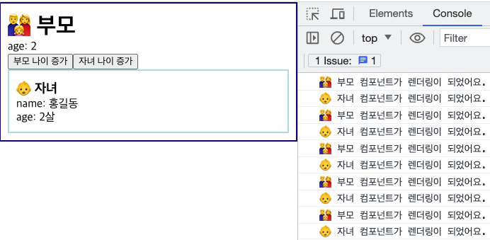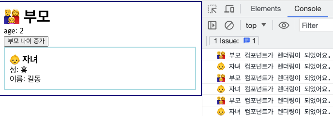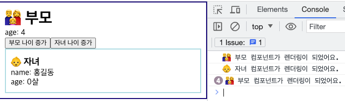 만약 부모 나이 증가를 클릭하면 부모컴포넌트만 렌더링 될 거라고 생각하지만 둘 다 출력이 된다.