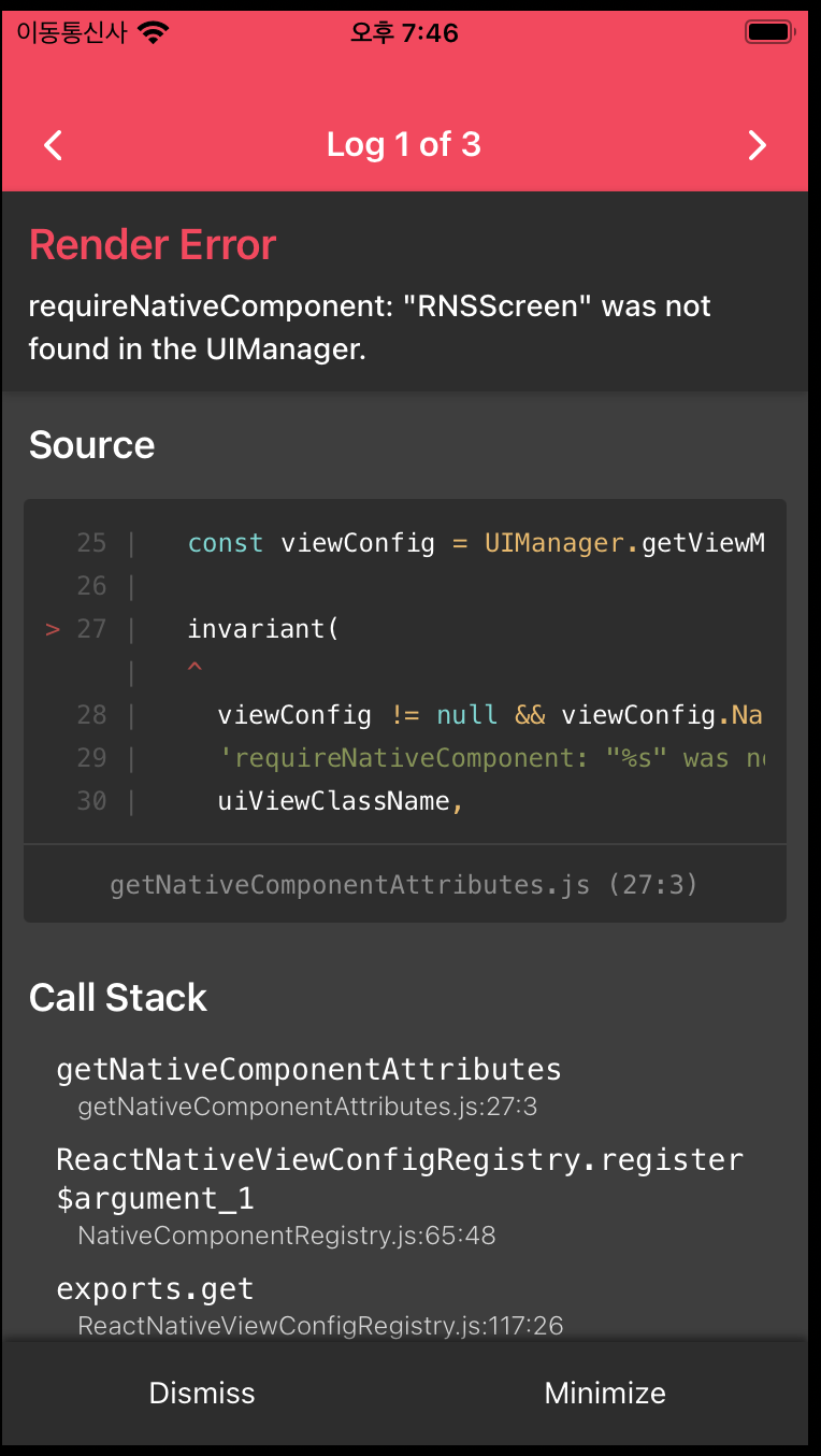 React Native "RNSScreen" was not found in the UIManager react native에서 Navigation을 사용하려고 코드를 작성했는데 에러가 발생했다. 특이한건 Android 에뮬레이터에서는 에러가 발생하는데 web으로 컴파일하니까