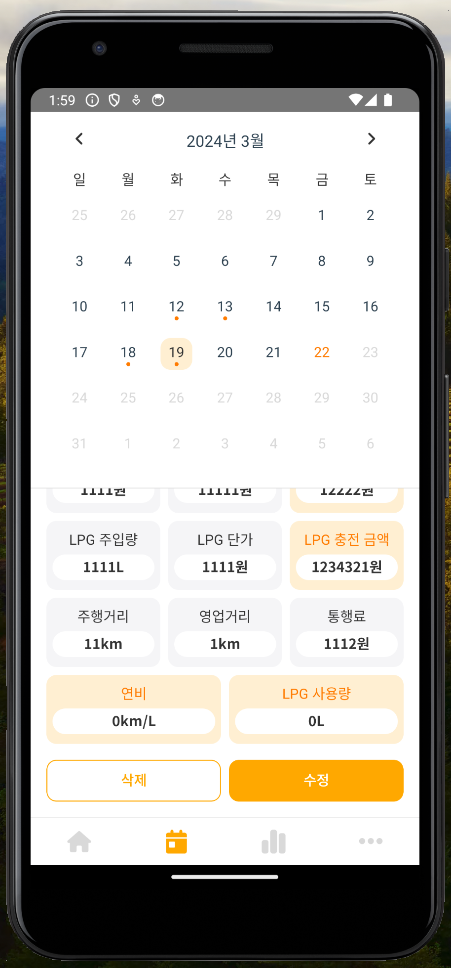 - 추가를 하면 달력에 mark가 찍혀야 되며, 운행정보 화면이 나와야 된다.