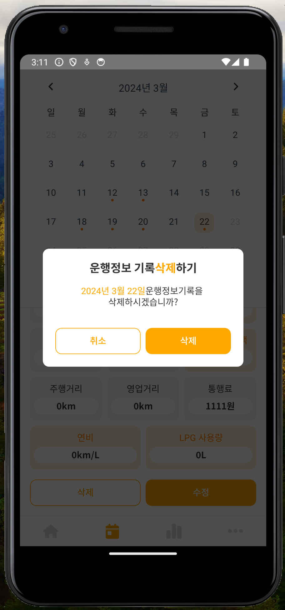 - 삭제를 하면 달력에 mark가 사라지고, 운행정보가 없습니다. 화면이 나와야 된다.