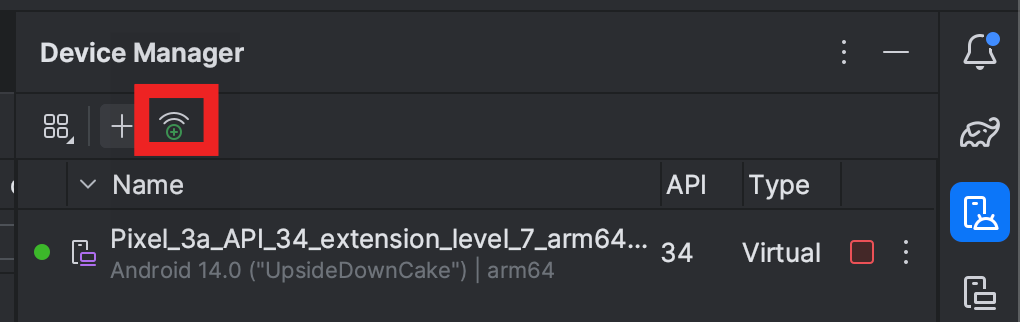 2. 애뮬레이터 클릭하고 와이파이 연결 클릭해서 Pair new devices over Wi-Fi 나오게 하고 qr연결하기