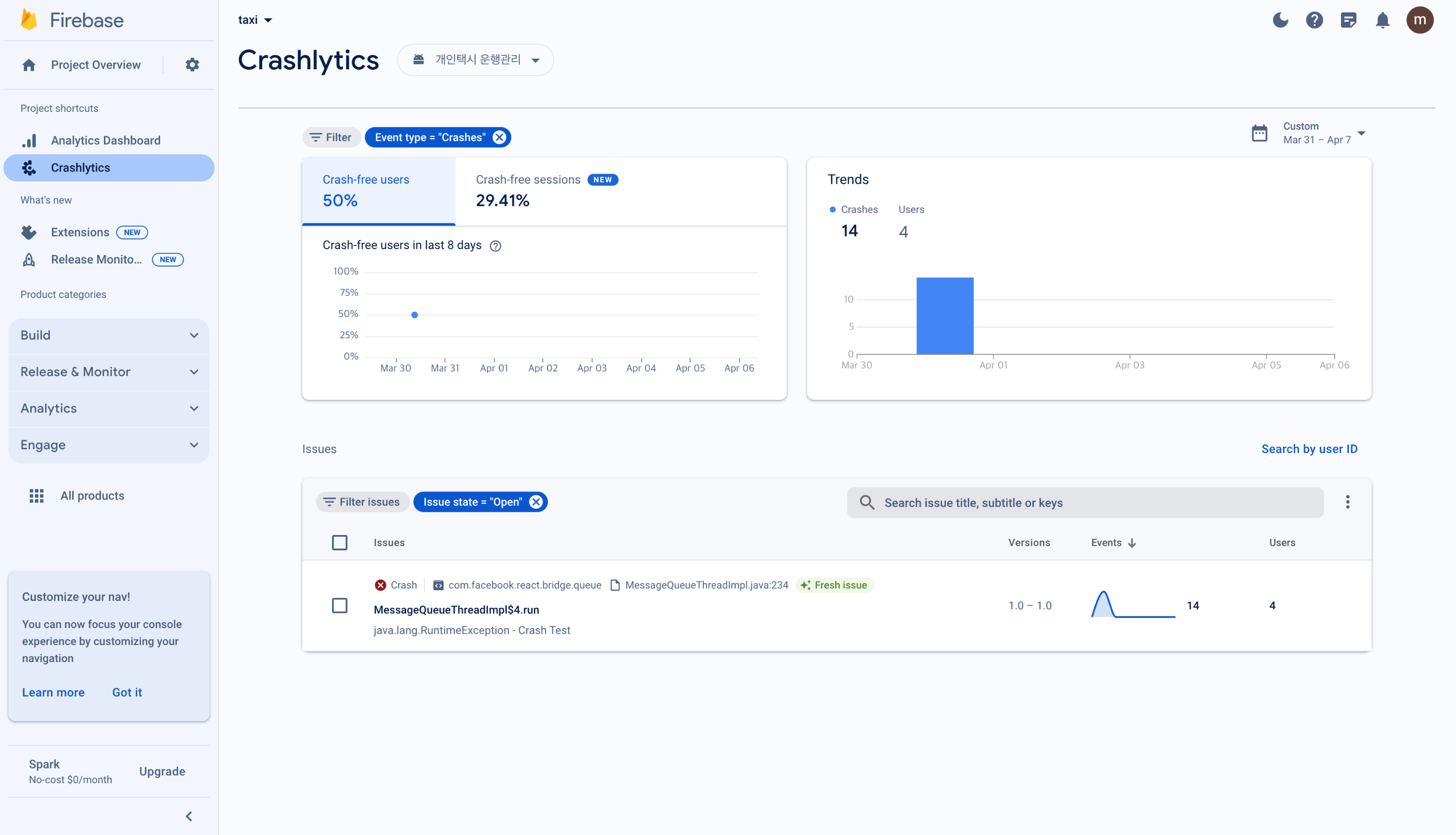 파이어베이스에서 Crashlytics에 들어가셔서 확인하시면 crash 된 걸 확인하실 수 있습니다.