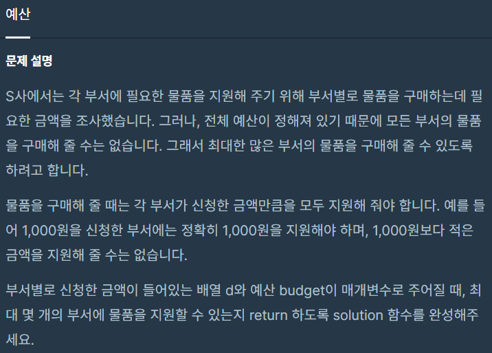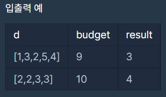 - budget - d배열을 뺀 횟수를 구해주기 = 지원 가능 부서 하나씩 더하기