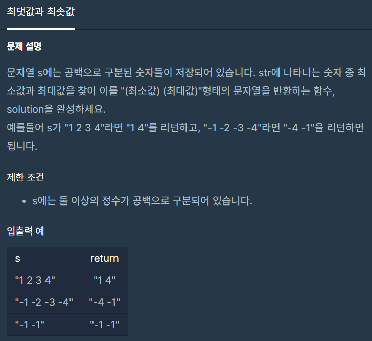 여기까지 프로그래머스 최댓값과 최솟값 해결방안에 대해 설명해보았습니다.