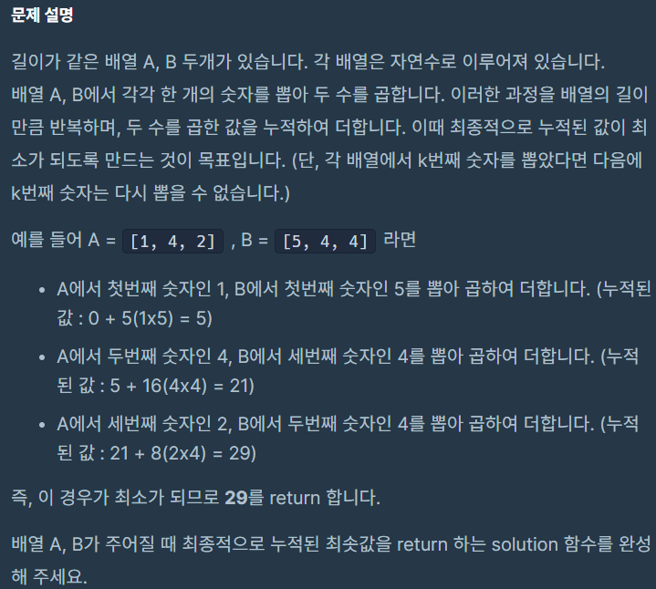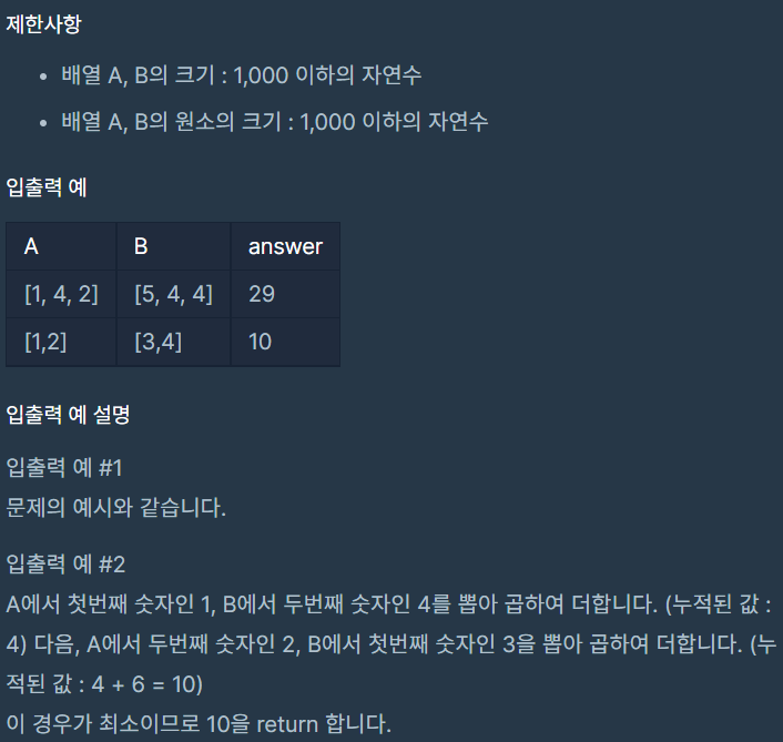 그래서 배열A는 오름차순으로 배열B는 내림차순으로 정렬한 뒤 각 배열의 index가 같은 원소끼리 곱해주고 더해주면 됩니다.