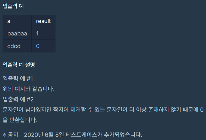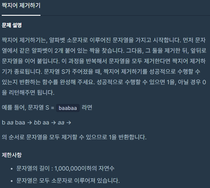 프로그래머스 짝지어 제거하기 해결방안 설명은 여기까지입니다.