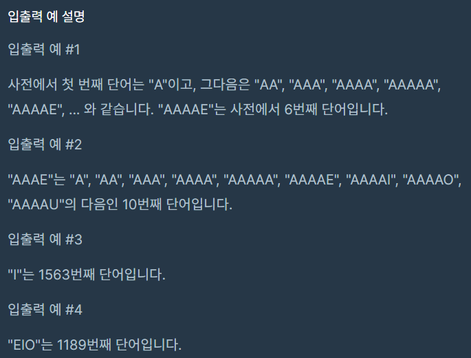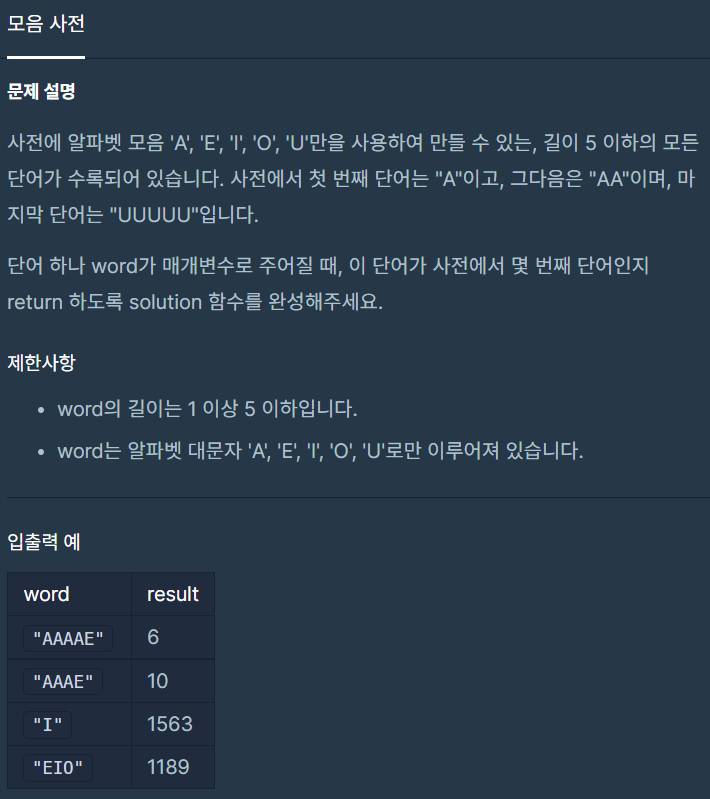 프로그래머스 모음 사전 해결방안 설명은 여기까지입니다.